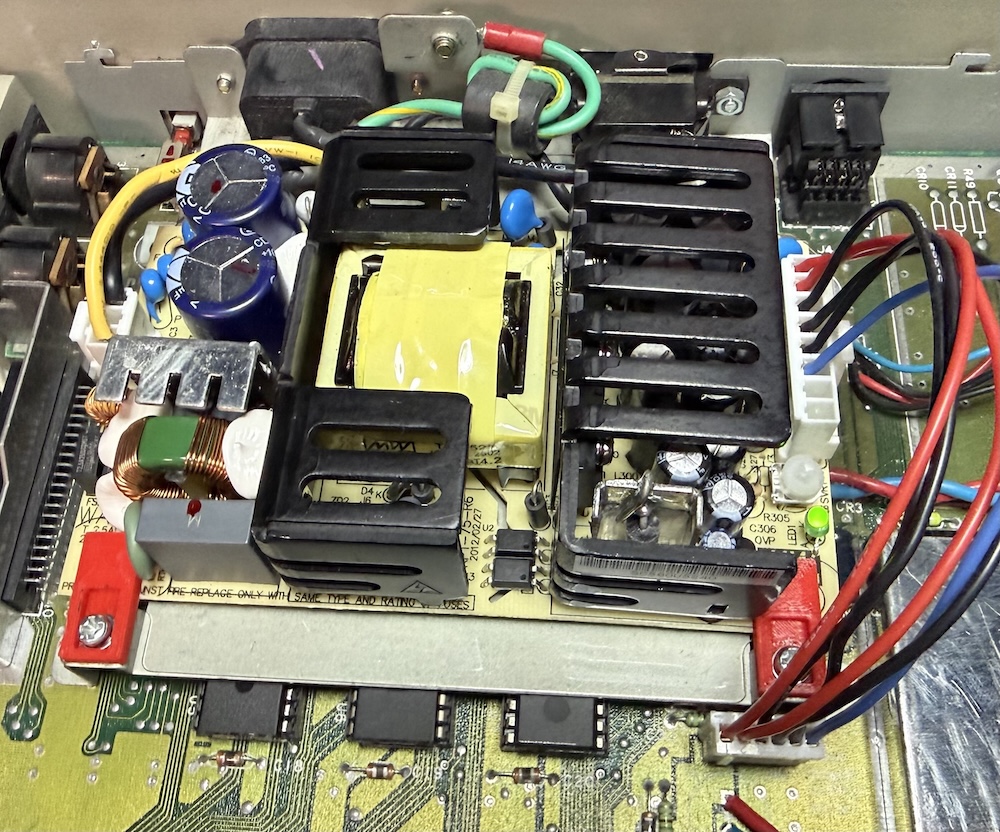 At this point, I was certain that the original power supply went bad, and also that the machine has pretty significant power spike on boot, likely due to capacitors charging up that would briefly draw over 3.2A, tripping my sensitive high-end bench power supply.